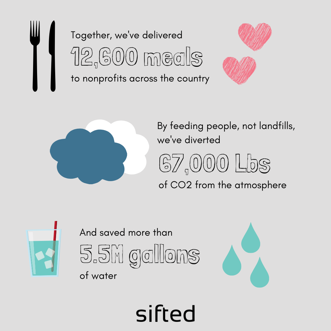 Sifted’s national presence will deliver coast-to-coast impact. In just two months since pilot-testing Copia’s service, we have donated more than 12,600 meals to Copia’s network of nonprofits in Atlanta, Seattle, Austin, Denver, and Nashville.
